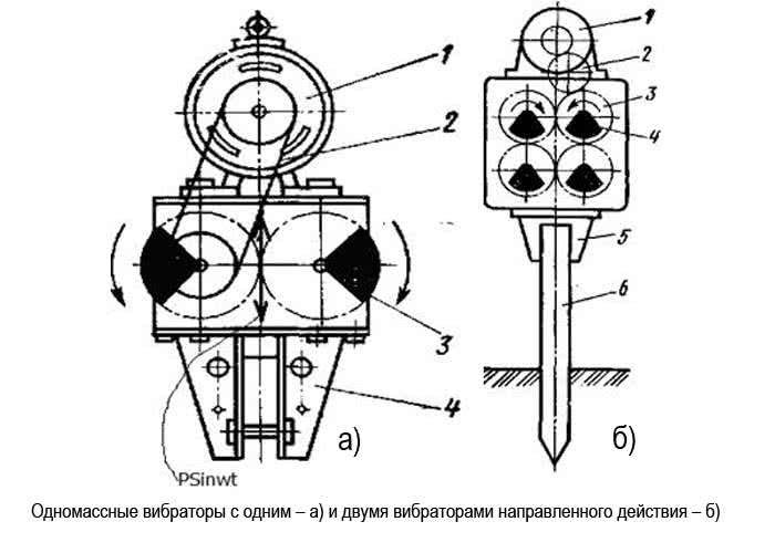 Одномассный вибропогружатель может иметь один или два вибровозбудителя направленного действия. В первом случае в конструкцию входят: