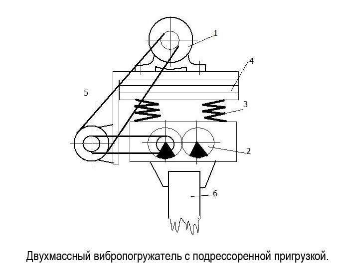 Один из вариантов двухмассной установки – вибропогружатель с подрессоренной нагрузкой. Двигатель (1) устанавливается на подрессоренной плите (4), которая оказывает давление на шпунт (6). На амплитуду колебаний масса плиты не влияет. Передача импульса от двигателя к вибровозбудителю (2) – клиноременная (5). Между этими узлами располагаются пружины-амортизаторы (3), назначение которых – защитить двигатель от вибраций.