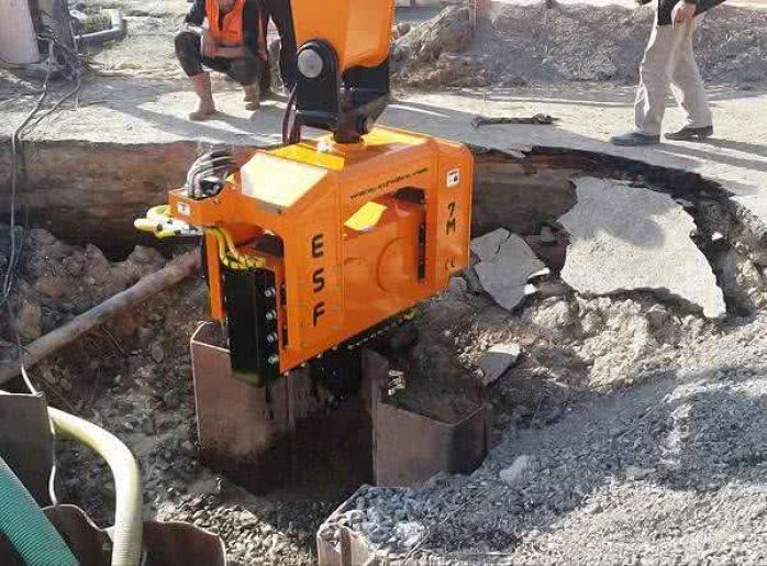 - вибропогружение. Шпунт погружается силой вибраций, воздействующих на оголовок. Этот метод эффективен на большинстве грунтов и относительно безопасен.