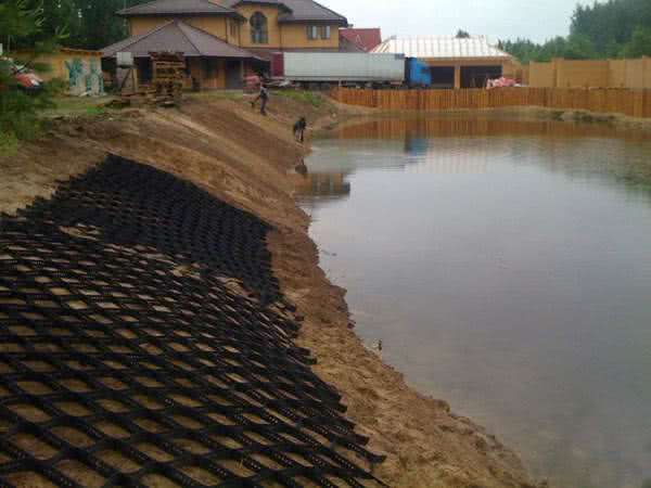 - армирование склонов геотекстильным полотном, металлическими либо пластиковыми сетками. При большой крутизне проблематично;